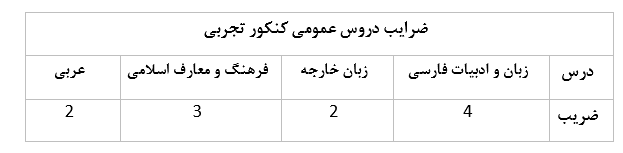 دروس عمومی کنکور تجربی شامل ادبیات فارسی، دینی، عربی و زبان خارجی هستند. زبان خارجی اصلی انگلیسی در نظر گرفته شده اما با توجه به درخواست داوطلب میتونه فرانسوی، روسی، اسپانیایی و… هم باشه. همچنین ضرایب هر کدام از این دروس رو هم میتونی توی مطلب برنامه کنکور تجربی ببینی.